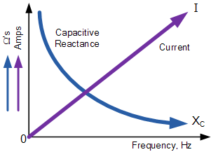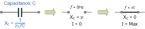 從上面的公式中我們可以看出容性電抗的值和因此,當(dāng)頻率增加時(shí),其整體阻抗(以歐姆為單位)向零減小,就像短路一樣。同樣,當(dāng)頻率接近零或直流時(shí),電容電抗增加到無(wú)窮大,就像開(kāi)路一樣,這就是電容阻斷直流的原因。