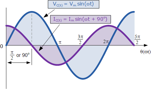 從電壓和電流波形和上面的描述,我們可以看到,電流總是將電壓引導(dǎo)一個(gè)周期的1/4或π/ 2 = 90 o “異相”由于這種充電和放電過(guò)程,電容器之間的差異。然后,交流電容電路中的電壓和電流之間的相位關(guān)系與我們?cè)谇耙粋(gè)教程中看到的交流電感完全相反。