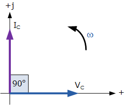 這種效應(yīng)也可以用相量圖表示,其中在純電容電路中,電壓“LAGS”電流為90 o 。但是,通過(guò)使用電壓作為參考,我們也可以說(shuō)電流“LEADS”電壓是一個(gè)周期的四分之一或90 o ,如下面的矢量圖所示。