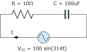 內(nèi)部電阻為10Ω,電容值為100uF的電容器連接到電源電壓 V (t) = 100 sin(314t)。計(jì)算流入電容器的電流。還構(gòu)造一個(gè)電壓三角形,顯示各個(gè)電壓降。