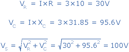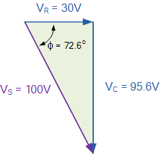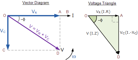 As V R = IR 和 V C = IX C 所施加的電壓將是兩者的矢量和,如下所示。