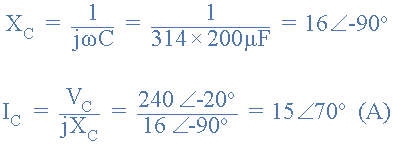 電壓兩端的電壓電容器與電源電壓相同。將此時(shí)域值轉(zhuǎn)換為極坐標(biāo)形式可以得到: V C =240∠-20 o (v)。容抗將為: X C = 1 /(ω.200uF)。然后,使用歐姆定律可以找到流入電容器的電流: