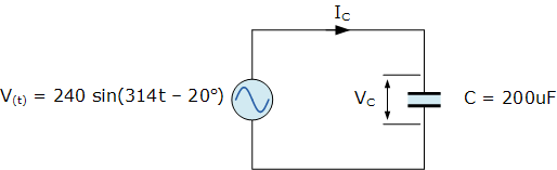 單相正弦交流電源電壓定義為: V (t) = 240 sin(314t - 20 o )連接到 200uF 的純交流電容。確定流入電容器的電流值并繪制得到的相量圖。