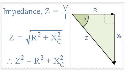 然而當(dāng)電阻器和電容器在同一電路中連接在一起,總阻抗的相位角介于0 o 和90 o 之間,具體取決于所用元件的值。然后通過(guò)使用阻抗三角形可以找到上面所示的簡(jiǎn)單RC電路的阻抗。
