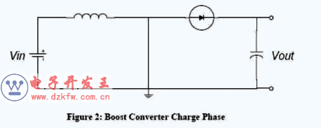在充電過程中,開關閉合(三極管導通),等效如下圖,開關(三極管)處用導線代替。這時,輸入電壓流過電感。二極管防止電容對地放電。由于輸入是直流電,所以電感上的電流以一定的比率線性增加,這個比率跟電感大小有關。隨著電感電流增加,電感里儲存了一些能量。