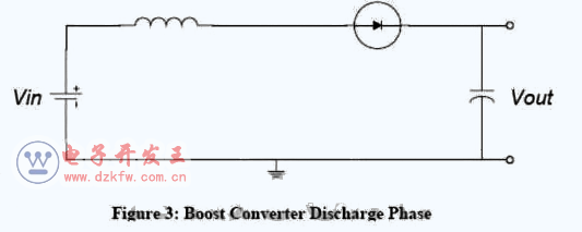 如下圖,這是當開關斷開(三極管截止)時的等效電路。當開關斷開(三極管截止)時,由于電感的電流 保持特性,流經電感的電流不會馬上變為0,而是緩慢的由充電完畢時的值變為0。而原來的電路已斷開,于是電感只能通過新電路放電,即電感開始給電容充電, 電容兩端電壓升高,此時電壓已經高于輸入電壓了。升壓完畢。