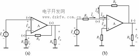 圖1(b)所示電路中,設輸入電壓的瞬時極性對地為正,由于從反相端輸入,則輸出電壓對地為負,由此可得三個支路中的瞬時流向,并由此判斷出集成運放的凈輸入電流減小,說明電路引入了負反饋。