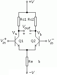 差分放大器也叫差動放大器是一種將兩個輸入端電壓的差以一固定增益放大的電子放大器,有時簡稱為“差放”。差分放大器通常被用作功率放大器(簡稱“功放”)和發射極耦合邏輯電路 (ECL, Emitter Coupled Logic) 的輸入級。如果Q1 Q2的特性很相似,則Va,Vb將同樣變化。例如,Va變化+1V,Vb也變化+1V,因為輸出電壓VOUT=Va-Vb=0V,即Va的變化與Vb的變化相互抵消。這就是差動放大器可以作直流信號放大的原因。     若差放的兩個輸入為,則它的輸出Vout為: