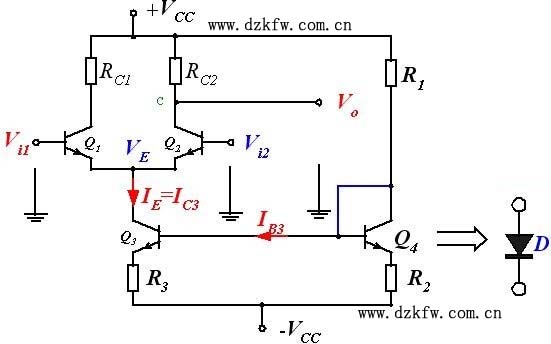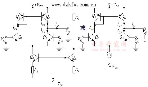 之偏壓或需要很高之電源電壓。 上圖Q3及Q4為電流鏡像恒流源代替電阻RE,使用恒流源可以得到高阻抗及固定電流,