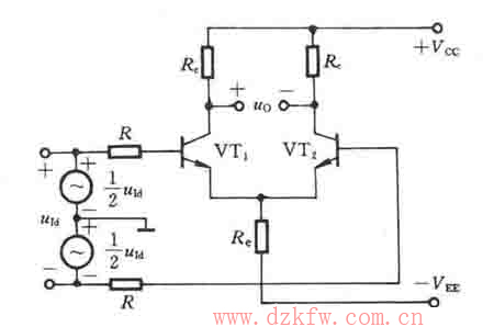 當外加一個輸入電壓時,由于電路結構對稱,VT1和VT2基極得到的輸入電壓將大小相等,但極性相反,如上圖所示。這樣的輸入電壓稱為差模輸入電壓,用uId,則放大電路輸出電壓的變化量為