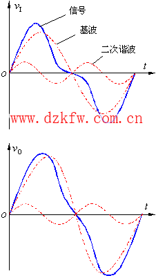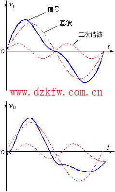 從信號(hào)的頻譜一節(jié)的討論可知,理論上許多非正弦信號(hào)的頻譜范圍都延伸到無窮大,而放大電路的帶寬卻是有限的,并且相頻響應(yīng)也不能保持常數(shù)。例如圖1中輸入信號(hào)由基波和二次諧波組成,如果受放大電路帶寬所限制,基波增益較大,而二次諧波增益較小,于是輸出電壓波形產(chǎn)生了失真,這種由于放大電路對(duì)不同頻率信號(hào)的增益不同,產(chǎn)生的失真叫作幅度失真。