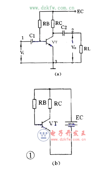 圖 1 ( a )是共發射極放大電路。 C1 是輸入電容, C2 是輸出電容,三極管 VT 就是起放大作用的器件, RB 是基極偏置電阻 ,RC 是集電極負載電阻。 1 、 3 端是輸入, 2 、 3 端是輸出。 3 端是公共點,通常是接地的,也稱“地”端。靜態時的直流通路見圖 1 ( b ),動態時交流通路見圖 1 ( c )。電路的特點是電壓放大倍數從十幾到一百多,輸出電壓的相位和輸入電壓是相反的,性能不夠穩定,可用于一般場合。