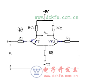 解決零點漂移的辦法是采用差分放大器,圖 9 是應用較廣的射極耦合差分放大器。它使用雙電源,其中 VT1 和 VT2 的特性相同,兩組電阻數值也相同, R E 有負反饋作用。實際上這是一個橋形電路,兩個 R C 和兩個管子是四個橋臂,輸出電壓 V 0 從電橋的對角線上取出。沒有輸入信號時,因為 RC1=RC2 和兩管特性相同,所以電橋是平衡的,輸出是零。由于是接成橋形,零點漂移也很小。