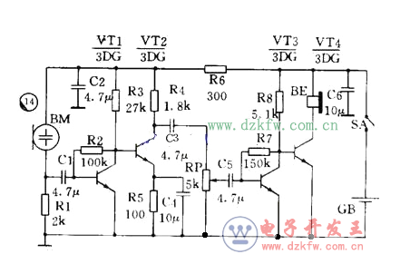 圖 14 是一個助聽器電路,實際上是一個 4 級低頻放大器。 VT1 、 VT2 之間和 VT3 、 VT4 之間采用直接耦合方式, VT2 和 VT3 之間則用 RC 耦合。為了改善音質, VT1 和 VT3 的本級有并聯電壓負反饋( R2 和 R7 )。由于使用高阻抗的耳機,所以可以把耳機直接接在 VT4 的集電極回路內。 R6 、 C2 是去耦電路, C6 是電源濾波電容。