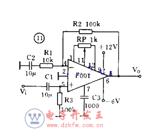 圖 11 是帶調零端的同相輸出運放電路。引腳 1 、 11 、 12 是調零端,調整 RP 可使輸出端( 8 )在靜態時輸出電壓為零。 9 、 6 兩腳分別接正、負電源。輸入信號接到同相輸入端( 5 ),因此輸出信號和輸入信號同相。放大器負反饋經反饋電阻 R2 接到反相輸入端( 4 )。同相輸入接法的電壓放大倍數總是大于 1 的。