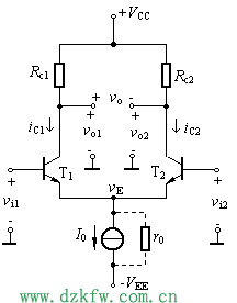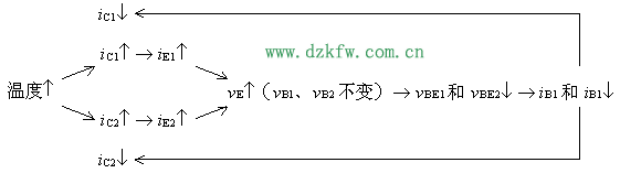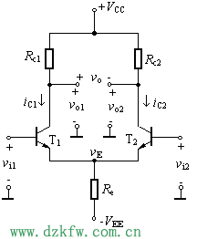 圖1 單端輸出時 抑制零點漂移的作用也可以從另一方面來理解。由BJT的工作特性我們知道,溫度升高時,集電極電流會增加。由于電路中Re的存在,將對電路產生如下影響: | |
