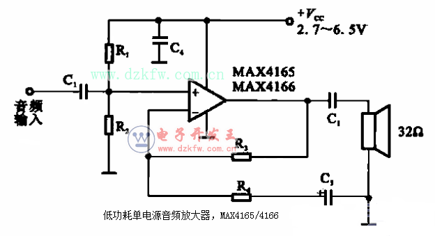 上圖所示是一種采用運算放大器MAX4165/66的低功耗單電源音頻放大電路,音頻信號經耦合電容器其cl后,經運算放大器放大后輸出驅動揚聲器發聲。
