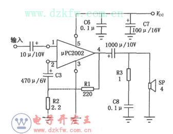本文介紹的是μPC2002的典型應用電路圖,μPC2002是音頻功率放大集成電路,采用5腳單列直插塑料封裝,按引線的形狀可分為H型與V型。該電路輸出功率大、失真度小,噪聲低,開機時沖擊聲小,并具有電源浪涌、過電壓和負載短路等保護電路,因而廣泛用于汽車立體聲收音機、錄放機中作音頻功率放大器。其典型應用電路如下圖所示。