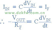 由于運算放大器在其反相輸入端的節(jié)點電壓為零,因此流過電容器的電流I將給出為: