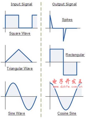如果我們將持續(xù)變化的信號(例如方波,三角或正弦波類型的信號)施加到微分放大器電路的輸入,則最終的輸出信號將發(fā)生變化,其最終形狀取決于電阻的RC時間常數(shù)/電容器組合。