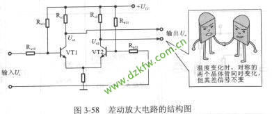 下面以典型的差動放大電路為例,T7024介紹其基本結構和識圖方法,圖3-58所示為差動放大電路的結構圖。