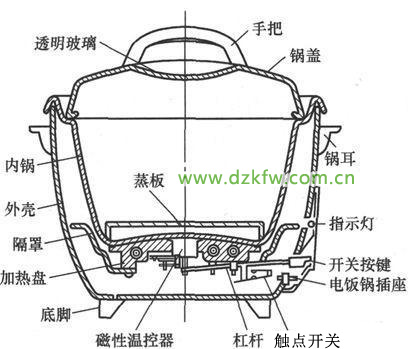 七 、煮夾生飯原因及檢修:此故障一般是限溫器內(nèi)的永久磁環(huán)磁力減弱造成的。此時(shí)可拆開電飯煲的限溫器檢查磁環(huán)是否斷裂、吸力如何。若永久磁環(huán)斷裂則必須更換相同型號(hào)的限溫器;若吸力減小,可調(diào)節(jié)限溫器上的調(diào)溫螺釘,每次調(diào)節(jié)1/4圈,調(diào)節(jié)一次試煮飯一次。。