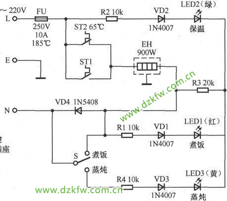 蒸燉與煮飯的工作原理基本相同,有幾點(diǎn)不同:一是將功能開關(guān)撥到蒸燉的位置;二是煮飯指示燈LED1不發(fā)光,而蒸燉指示燈(黃色發(fā)光管)LED3發(fā)光;三是在蒸燉時(shí),市電電壓通過二極管VD4構(gòu)成回路為加熱器EH供電,使它進(jìn)入半功率的加熱狀態(tài)。