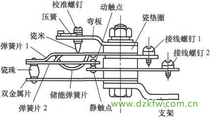 雙金屬溫控器由雙金屬片、觸點(diǎn)、壓簧、瓷米、瓷珠、支架等構(gòu)成,如圖3-5所示。