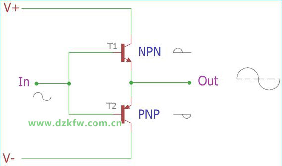 上圖中顯示了一個理想的 B 類放大器配置。它由兩個有源器件組成,在正弦波的正半周期和負(fù)半周期中一個一個地偏置,因此信號從正端和負(fù)端被推或拉到放大電平,并結(jié)合結(jié)果我們得到完整的輸出周期.每個設(shè)備打開或激活半個周期,因此效率得到提高,與 A 類放大器的 25-30% 效率相比,理論上它提供超過 60% 的效率。我們可以在下圖中看到每個設(shè)備的輸入和輸出信號圖。B類放大器的效率不超過78%。此類產(chǎn)品的散熱量降至最低,提供了較小的散熱空間。