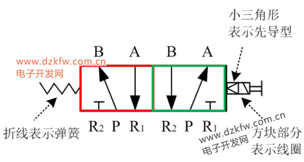 左側紅框表示電磁閥失電時狀態,箭頭表示氣體流向,右側綠框表示電磁閥得電時氣體流向狀態。