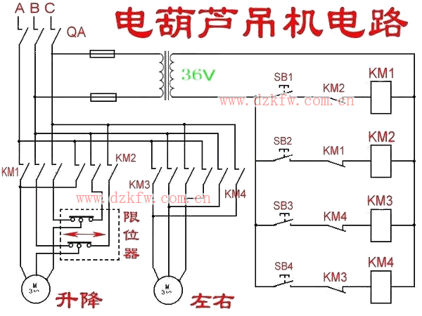 上圖為一般電動(dòng)葫蘆的電路圖,可以看到并沒(méi)有畫出地線的,也就是說(shuō)很多廠家安裝時(shí)候未必都有裝地線的,一樣可以運(yùn)行,這是三相的兩個(gè)電機(jī),一個(gè)控制升降,一個(gè)控制左右,通過(guò)接觸器來(lái)連鎖,只要空氣開(kāi)關(guān)QA合閘,SB1-SB4任何一個(gè)按鈕按下,兩個(gè)電機(jī)種的一個(gè)就有電過(guò)來(lái)了,電機(jī)就能運(yùn)行,電動(dòng)葫蘆就處于工作狀態(tài)。