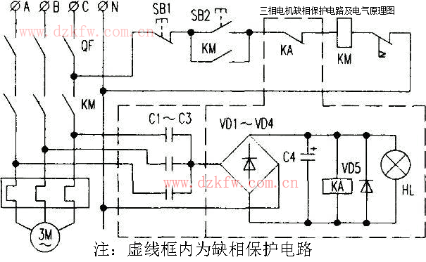 缺相保護電路如圖中的虛線框內所示。從三相線路中。