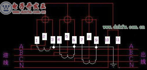 圖中可以看出,1、3接線柱;4、6接線柱;7、9接線柱分別為A、B、C三相電流線圈,diangon.com1、4、7接線柱接電源側(cè)A、B、C。3、6、9接線柱接負(fù)載。2、5、8接線柱為電壓線圈。10、11接線柱接零線N。