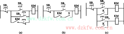圖2中的接觸器輔助觸點KM是自鎖觸點,其作用是,當放開啟動按鈕SB2后仍可保證KM線圈通電,電動機運行(長動)。通常將這種用接觸器本身的觸點來使其線圈保持通電的環節稱做自鎖環節。如果啟動按鈕SB2不并聯觸點KM,則松開SB2后KM線圈斷電,電動機停止運行,此即為點動方式。點動用于機床刀架、橫梁、立柱的快速移動以及機床的調整對刀等。圖3(a)、(b)、(c)所示分別為用按鈕、開關、中間繼電器來實現點動的控制線路。長動與點動的主要區別是控制電器能否自鎖。