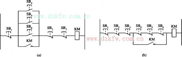 在大型機床設備中,為了操作方便,常要求能在多個地點對機床進行控制。如圖4(a)中將啟動按鈕并聯、停止按鈕串聯,可在三個地方對機床實行啟停控制。圖4(b)中則將啟動按鈕串聯,只有幾個啟動按鈕都被壓下時設備才能工作,可保證操作安全。