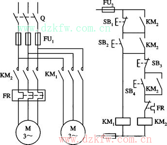 某些機床經常要求電動機有順序地啟動,如主軸必須在液壓泵工作后才能工作,主軸旋轉后工作臺才能運動,主軸停轉后潤滑泵才能停止工作等等。(http://m.diks.com.cn/版權所有)圖5中,啟動時,合上開關Q,按下SB2,KM1線圈得電自保,電動機M1啟動運轉;再按下SB4,KM2線圈得電自保,M2啟動,同時將SB1鎖住。停車時,先按下SB3,KM2線圈失電,其常開輔助觸頭復位,M2停轉; 再按下SB1,KM1線圈失電,M1停轉。