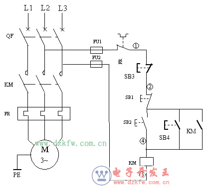 啟動:按下甲乙兩地(任意)啟動按鈕SB2或SB4→KM線圈得電吸合→其常開輔助觸頭閉合自鎖→其主觸頭閉合接通電動機主回路→電動機M運轉。