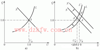 無功功率對電壓水平由決定性的影響,電力系統中各種用電設備吸收的無功功率大多數與所加電壓有關,系統的Q-U特性曲線如圖2(a)所示,圖中曲線L為負載特性曲線,S為系統特性曲線,兩者的交點A確定了負荷節點的電壓值UA,在這一電壓下達到了無功功率的平衡。若節點無功負荷增加,如圖2(b)所示,曲線L移到