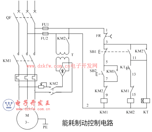 能耗制動控制電路,是電機單向運轉帶全波橋式整流能耗制動的控制電路。在電機運行時,按下停止按鈕SB1,接觸器KM1線圈失電,電機脫開電源。同時,接觸器KM2得電吸合,其常開觸點閉合,將橋式整流電路接入定子繞組中,由A相流入C相流出,產生一個反向的制動轉矩,使電動機停止轉動。當電機轉速接近于零值時,時間繼電器KT的延時斷開常閉觸點延時動作,使KM2和KT的線圈失電,制動結束。