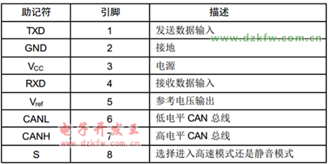 即從CAN控制芯片輸出邏輯電平到CAN收發器,然后經過CAN收發器內部轉換將邏輯電平轉換為差分信號輸出到CAN總線上,CAN總線上的節點都可以決定自己是否需要總線上的數據。具體的引腳定義如下: