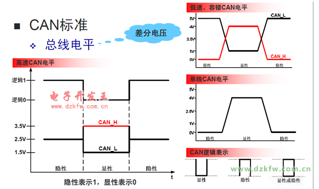 CAN_H-CAN_L > 0.9V 時候為顯性的,邏輯信號表現為"邏輯0"- 低電平。