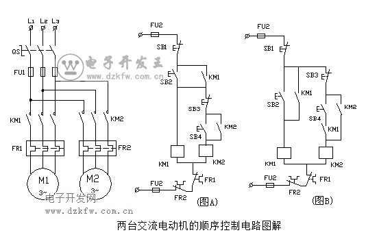 圖B:控制電路由KM1線圈電路和KM2線圈電路單獨(dú)構(gòu)成。KM1的動(dòng)合觸點(diǎn)作為一控制條件,串接在KM2線圈電路中,只有KM1線圈得電吸合,其輔組助動(dòng)合觸點(diǎn)閉合,此時(shí)才能控制KM2線圈電路。停止按鈕SB3只能控制M2電動(dòng)機(jī)的停轉(zhuǎn),停止按鈕SB1為全停按鈕。本電路只有滿足M1電動(dòng)機(jī)先起動(dòng)的條件,才能起動(dòng)M2電動(dòng)機(jī)。