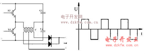 ④t4時間:開關K1、K2均截止,又形成死區。如此反復在負載上就得到了如圖11.3的電流,實現了逆變的目的。