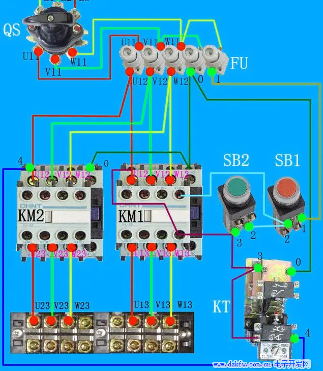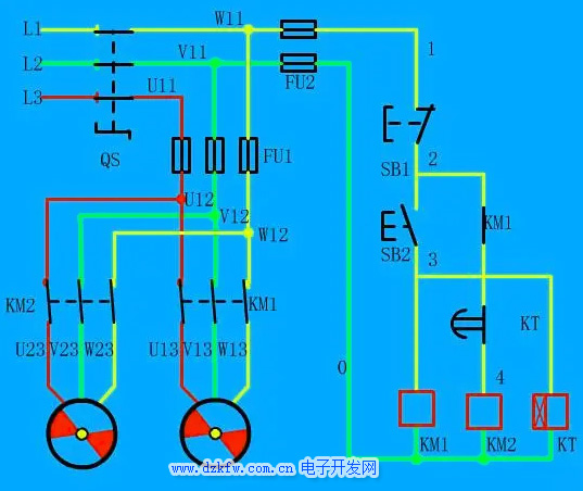 主線路:斷路器出來三根火線進(jìn)熔斷器,然后進(jìn)接觸器,這里注意,KM1,與KM2的進(jìn)線是一樣的都是U---V----W.。而且出線部分也是一樣的,沒有改變相序。這個(gè)兩個(gè)電機(jī),而正反轉(zhuǎn)需要改變其中兩項(xiàng)的相序,從而改變電機(jī)轉(zhuǎn)向。