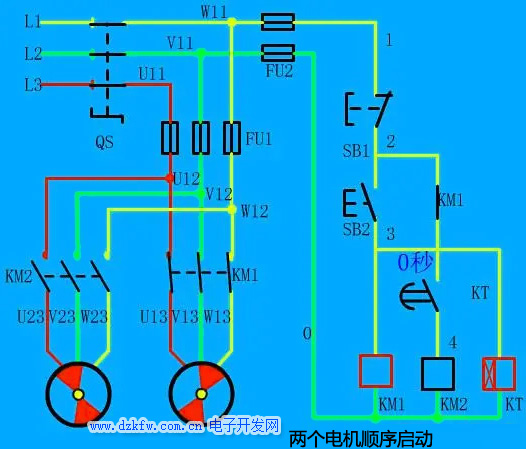 這是一個(gè)順序啟動(dòng)電路,首先我們看這跟電路圖,有兩個(gè)電機(jī),按鈕啟動(dòng)按鈕KM1得電吸合,同時(shí)時(shí)間繼電器得電計(jì)時(shí)。
