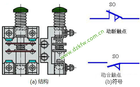 下圖為幾種操作類型的行程開關(guān)動(dòng)作原理示意圖及圖形符號。
