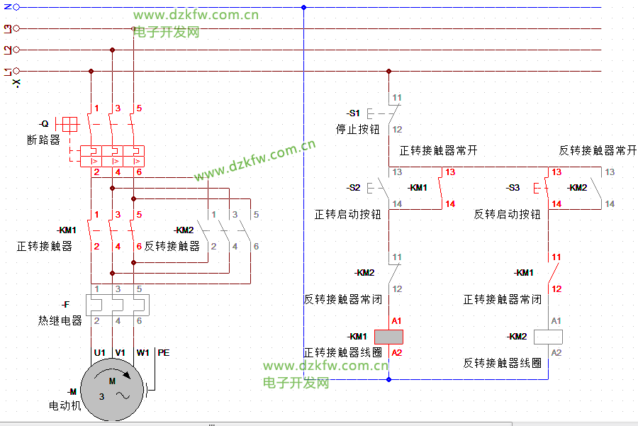 首先,要連接電機正反轉電路需要一個停止按鈕,一個正轉啟動按鈕,一個反轉啟動按鈕,還需要兩個接觸器,兩個接觸器一定要常開常閉的輔助觸點都有的,比如說1211的接觸器。按上圖的電路圖連接。