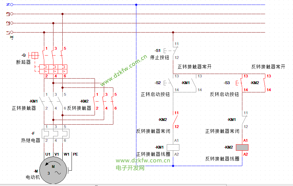 要學習電機電機正反轉電路一定要了解電機正反轉工作原理,就是當我們按下正轉啟動按鈕的時候,電機會正轉,這時候按下反轉啟動按鈕是不起作用的,只有按下停止按鈕,電動機停止以后才能啟動電機反轉。這種電路利用了兩個接觸器的輔助觸點,實現自鎖和互鎖的功能,實現了電機正反轉的控制。