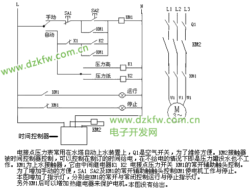 電接點(diǎn)壓力表常用在水塔自動(dòng)上水裝置上,Q1是空氣開關(guān),為了維修方便。KM2接觸器被時(shí)間控制器控制,可以控制在制訂的時(shí)間給電,在不給電的情況卞即是壓萬(wàn)罐沒水也不工作。KM1為上水接觸器,它由中間繼電器K1 K2電接點(diǎn)壓力開關(guān) KM1的常開輔助觸頭控制。為了增加手動(dòng)的方便,SA1 SA2及KM1的常開輔助觸觸頭控制KM1使電機(jī)工作與停止。本圖增加了指示燈,分別由KM1的常開與常閉控制運(yùn)行與停止指示燈。另外KM1后可以增加熱繼電器來(lái)保護(hù)電機(jī)。本圖沒有給出。
