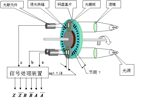 增量式編碼器可利用光電轉換原理輸出A、B和Z三組方波脈沖;A、B兩組脈沖相位差90度,能夠判斷出電機的旋轉方向,而Z相為每轉一圈輸出一個脈沖,用于基準點定位。此編碼器原理構造簡單,機械平均,并且壽命可達幾萬小時,具有較強的抗干擾能力,可靠性高。但是是無法輸出軸轉動的絕對位置信息。